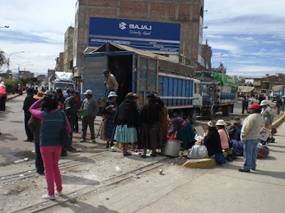 Am nächsten Tag machen wir uns auf den Weg zu den verschiedenen Reiseagenturen und versuchen, irgendwie aus der Stadt herauszukommen. Die Informationen, die wir erhalten, sind so vielfältig wie meine Schummelversuche damals in der Schule. Eine genaue Auskunft kann uns keiner geben, die Infos reichen von "Busbahnhof geöffnet", "eventuell fährt heute Abend ein Bus" und "kommt um 18 Uhr wieder". Vorher irren wir durch die von Demonstranten und Demonstrantenlager errichtete Stadt Puno.